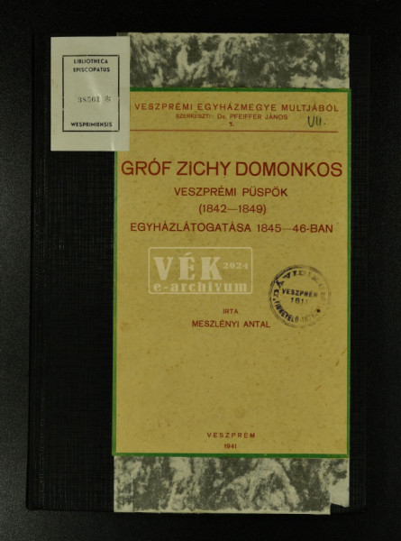 Meszlényi Antal Gróf Zichy Domonkos veszprémi püspök (1842–1849) egyházlátogatása 1845–1846-ban című, a Veszprémi Főegyházmegye újkori történetét feldolgozó monográfiák közé tartozó műve 1941-ben jelent meg, A Veszprémi Egyházmegye múltjából sorozat 7. részeként. A szerző római katolikus pap és bölcsészdoktor; történészként főként a magyar állam és az egyház viszonyával foglalkozott.