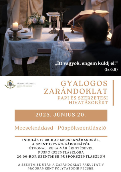 A gyalogos zarándoklat a mecseknádasdi Árpád-kori Szent István-kápolnától indul 17 órakor Rékavár érintésével Püspökszentlászlóra, ahol 20 órakor a szentelendőkért felajánlott szentmise kezdődik. A szentmisét Mihovics Szebasztián újmisés mohácsi káplán mutatja be, majd a liturgia után a gyalogos zarándoklat fakultatív programként halad tovább Pécsre.