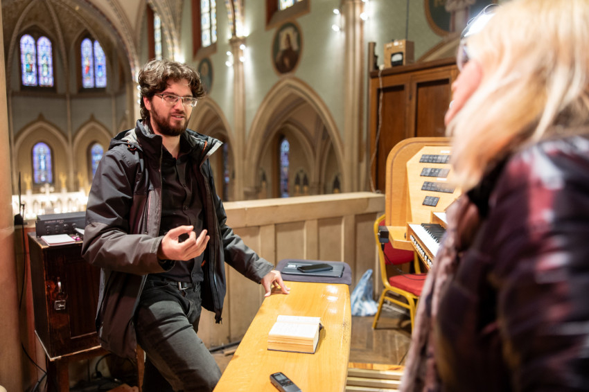 Ha zenekari mise van, egészen hátra kell húzódnia a mellékhajó feletti karzatszakaszra, ahonnan szinte sem a karmestert, sem az oltárt nem látja, és alig hallja, amit játszik. Ünnepeken előfordul, hogy miközben még kíséri a mise végén az éneket, játszópadostól hátratolja az énekkar néhány tagja, hogy elő tudjanak készülődni a zenekari miséhez.