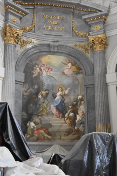 Ennek megfelelően a restaurátorok lemosták, illetve megtisztították az 1944-ben készült falfestést, és helyreállítják az eredeti, 18. századi rozettás díszítő falfestést. A szentélyben is megtörtént az eredeti díszítő architektúrafestés visszaállítása, az 1944–47 között készült Kontuly Béla-kép elfedésével. A freskó még Pétery József püspök kérésére készült el, aki 1942-től volt az egyházmegye főpásztora. Többek között egy 19. századi földrengés következtében akkor a belső tér megújítására mindenképp szükség volt.