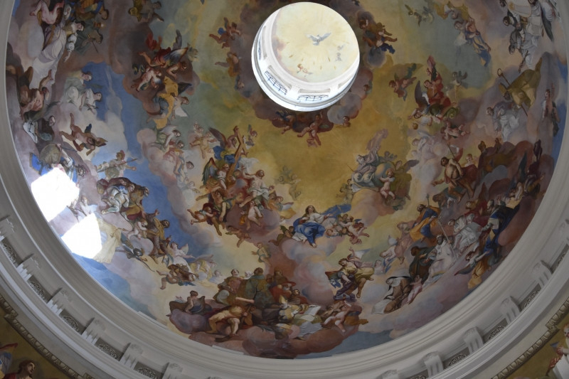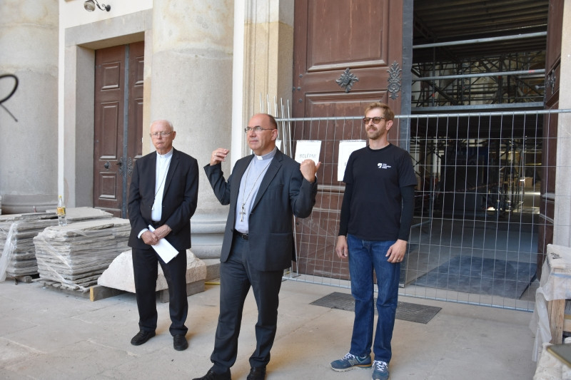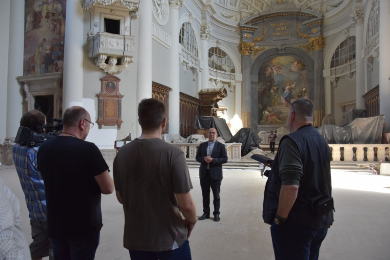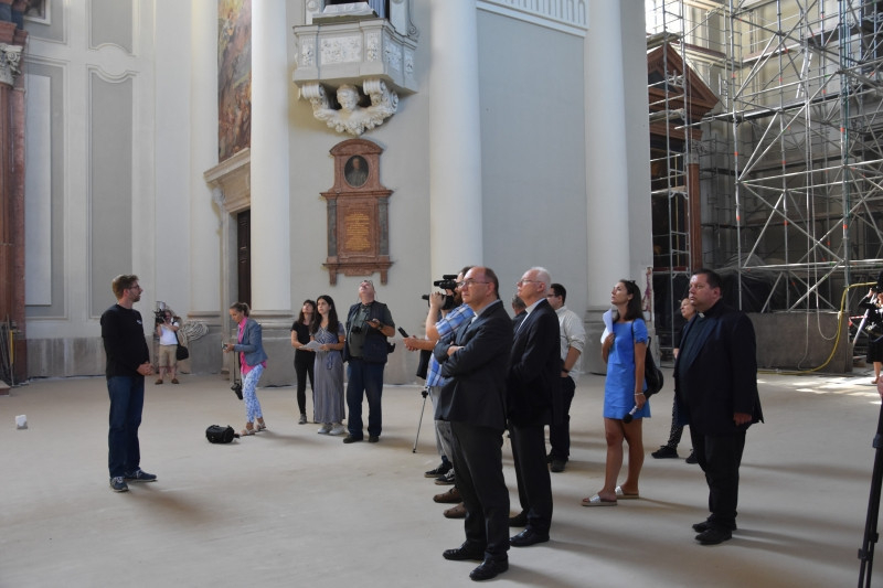 A váci Nagyboldogasszony-székesegyház felújítása 2021 tavaszán kezdődött meg, azóta a munkálatok folyamatosan zajlanak. A sajtó munkatársainak korábban már volt lehetőségük a munkafolyamatokba bepillantást nyerni, a mostani alkalom azonban különleges volt, hiszen kész állapotban tekinthették meg a helyreállított kupolafreskót és az eredeti barokk mintára készült architektúrafestést, a restaurált főoltárt, valamint tájékoztatást kaphattak a további tervezett munkálatokról.
