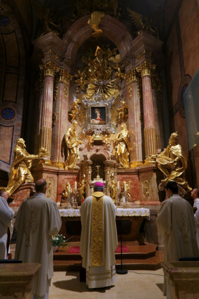 A szentmise végén a Könnyező Szűzanya kegyoltáránál Mária-köszöntőt imádkoztak Veres András győri megyéspüspök vezetésével.