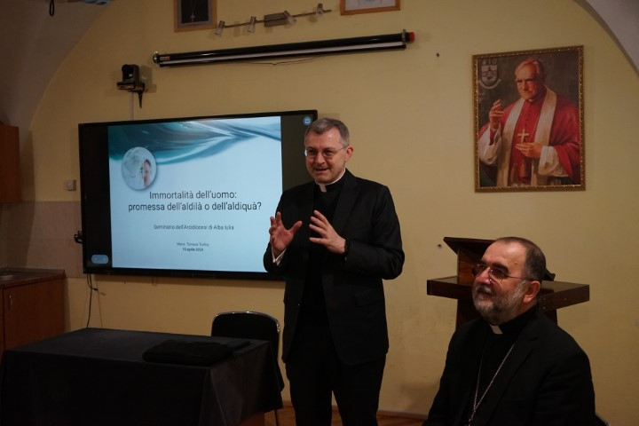 A püspöki szinódus főtitkárságának officiálisa, aki korábban a Kultúra Pápai Tanácsának munkatársa volt, a gyulafehérvári szemináriumban tett látogatása során Immortalità dell’uomo: promessa dell’aldilà o dell’aldiquà? (Az ember halhatatlansága: a túlvilág vagy az itt és most ígérete?) címmel tartott előadásában az Egyház jelenkori kihívásait elemezte a keresztény hitet és etikát érintő modern, tudományos és technológiai fejlesztések, változások tükrében.