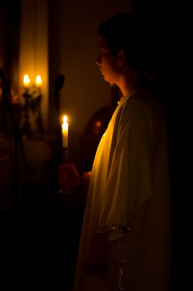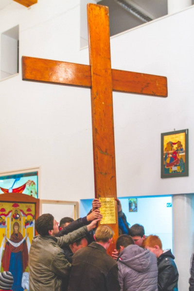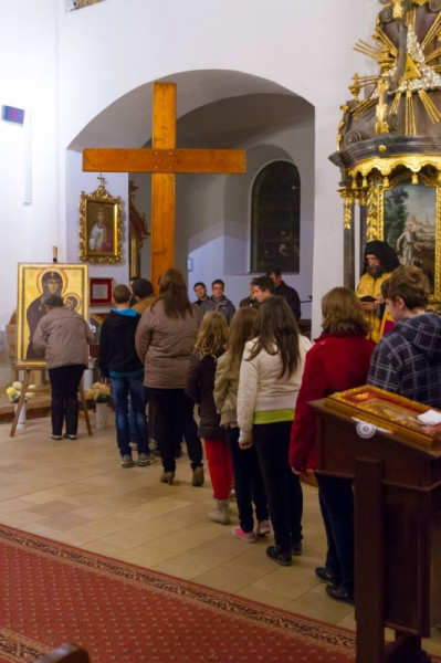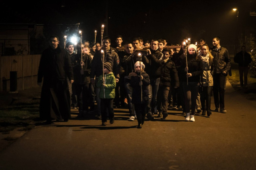 A zsúfolásig megtelt hajdúdorogi templomban a püspöki vecsernye keretében fogadták a keresztet a görögkatolikus fiatalok, majd a szertartást követően fáklyás menetben vitték át a Szent Bazil Oktatási Központ középiskolájának kápolnájába. Itt egy rövid filmvetítés után zsoltározással virrasztottak a kereszt körül.