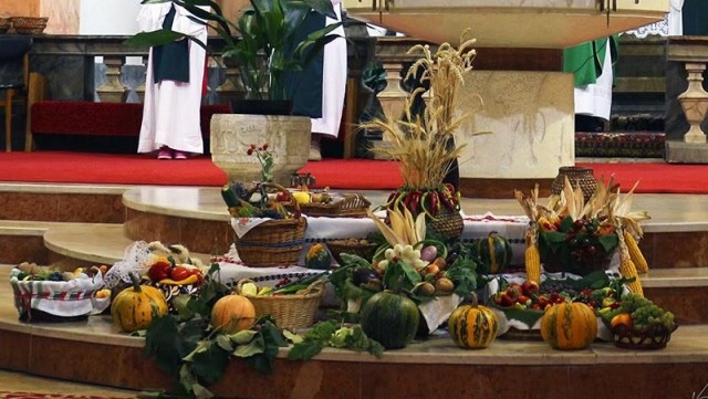 A plébániatemplomban főleg a helyi Kolping Család tagjai készítettek díszes, sokféle és sokszínű zöldséggel és gyümölcsökkel gazdag kosarakat az oltár elé, melyek megáldására a vasárnap délelőtti szentmisében került sor.