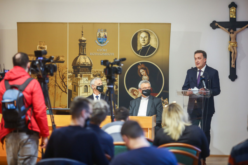 A média képviselőit a győri szeminárium épületében várták sajtótájékoztatóra. Veres András győri megyéspüspök annak a folyamatnak a jelentőségét hangsúlyozta, melynek során a Győri Egyházmegye életének, működésének meghatározó intézményei újulnak meg. „Győrben a kommunizmus évtizedeiben csak a bencések gimnáziuma működhetett. A rendszerváltás szabadságában létrehozott intézmények sok esetben már indulásukkor elavult épületet vehettek birtokba. Ma a szülők igényesek, megnézik, hova küldik gyerekeiket, és döntésükben nemcsak az oktatás-nevelés színvonala számít. Ezért különösen nagy jelentőségű ez a beruházás a győri belváros kiemelt és frekventált helyszínén. Bizalom van bennem, és imádkozom, hogy mintegy 1100 nap múlva a helyszínen tudjunk beszámolni az elkészült munkáról” – fogalmazott a főpásztor.