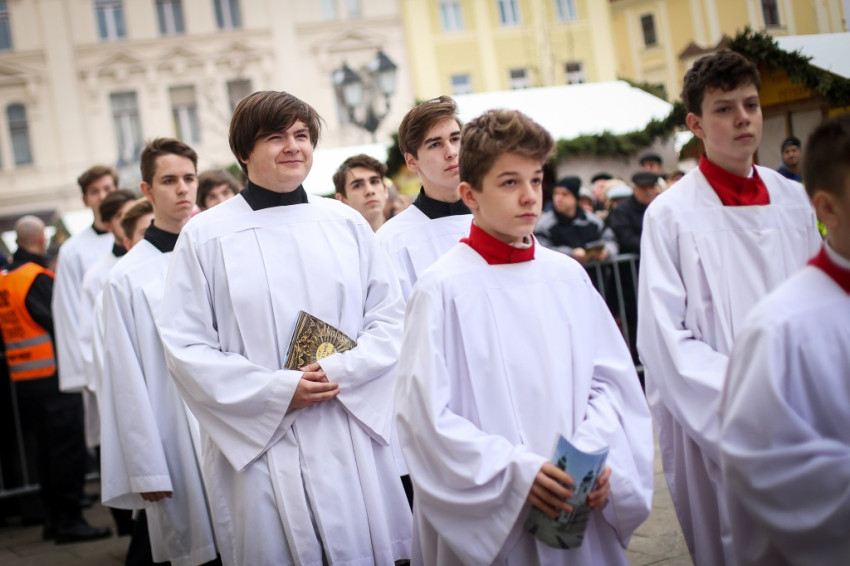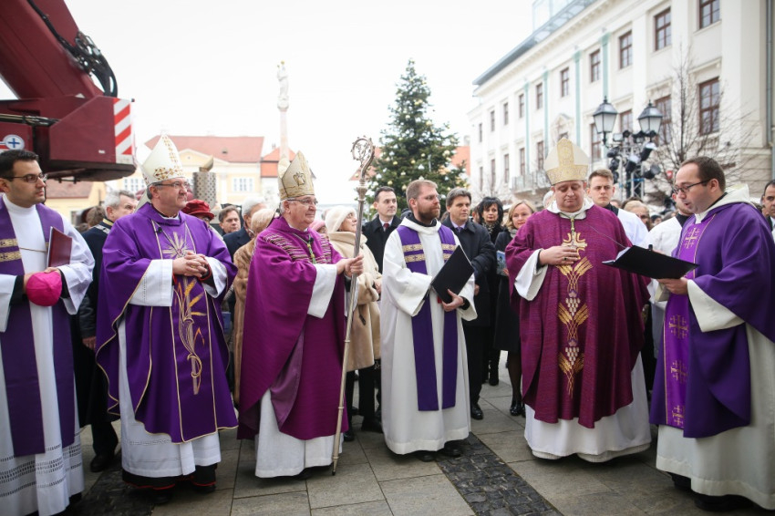 A felszentelés liturgiája előtt Sárai-Szabó Kelemen OSB, a Loyolai Szent Ignác bencés templom templomigazgatója köszöntötte a résztvevőket, a főpásztorok mellett – többek között – Borkai Zsoltot, Győr polgármesterét, Bogisich Ferenc üzletembert, aki vállalkozótársaival anyagilag segítette a harangöntés tervének megvalósulását, valamint Johannes Grassmayrt, az innsbrucki Grassmayr harangöntő műhely vezetőjét. Sárai-Szabó Kelemen elmondta, az ünnep örömét beárnyékolja, hogy Horváth Dori Tamás OSB, a győri Szent Mór Bencés Perjelség nyugalmazott perjele december 14-én elhunyt.