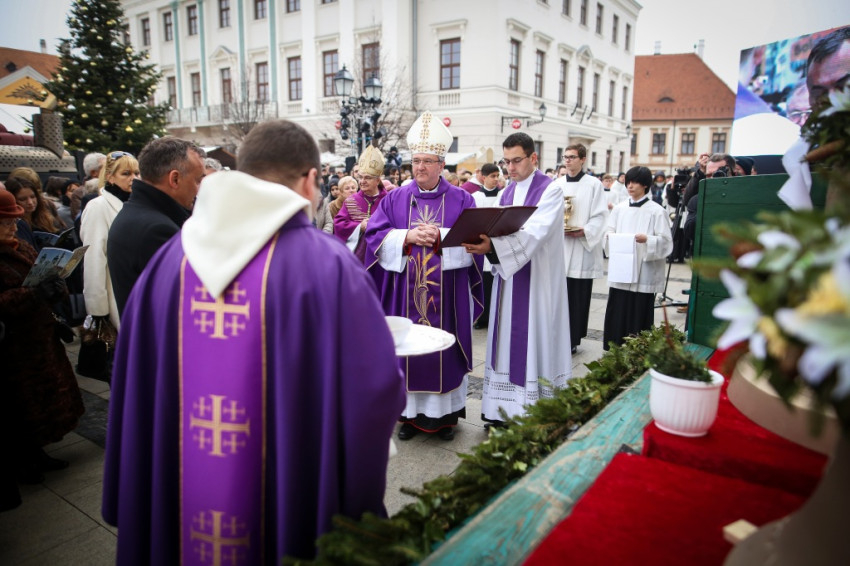 A felszentelési liturgiát követő szentmise főcelebránsa Várszegi Asztrik volt. A pannonhalmi főapát homíliájában a harangok történetét történelmi kontextusba helyezte, párhuzamba állította a győri harangok és a moszkvai Megváltó Krisztus-székesegyház sorsát, emlékezve Horváth Dori Tamásra, akivel egy közös utazás alkalmával lehettek a moszkvai katedrális újraépítésének tanúi. Várszegi Asztrik kiemelte, a bencés rend 1802-ben történt visszaállítását követően Győrben a Jézus Társasága örökébe lépett azzal, hogy átvette a Loyolai Szent Ignác-templom és a hozzátartozó oktatási intézmény fenntartását. A pannonhalmi főapát emlékeztetett Bonaparte Napóleon 1809-es győri tartózkodására is. Várszegi Asztrik rámutatott arra, hogy Napóleon erőszakos nacionalizmusával egy olyan folyamatot indított el, amely csak az első világháború végén bontakozott ki: a „dinasztiák Európájának” felbomlasztása a „nemzetek Európájának” létrejöttét eredményezte. A főapát felhívta a figyelmet arra, hogy a győri bencés templom négy harangját az első világháború idején rekvirálták el.
