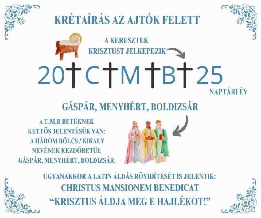 Az ajtó szemöldökfájára szentelt krétával fölírja az évszámot, ami a népi értelmezés szerint a háromkirályok nevének – Gáspár, Menyhért, Boldizsár – kezdőbetűit tartalmazza, valójában azonban a három betű a latin áldásformula kezdőbetűi: