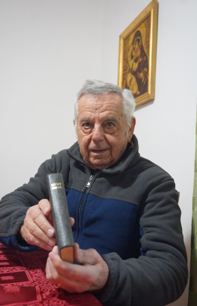 Emil bácsi: Keresztapám rendkívül vallásos ember volt. De akkoriban a Biblia tiltott irodalomnak számított. Ezt a magyar nyelvű Bibliát Londonban nyomtatták. Esküvőnk napján ezt adta a kezünkbe, és azt mondta: „Kedveseim, tanuljátok meg egymást szeretetben elszenvedni.” Megdöbbentem. Az élete legszebb napján ilyet mondani az embernek, hogy szenvedni, mikor egyáltalán nem erre készülünk. De hát nem sok idő kellett rájönni, hogy, hú de igaza volt.