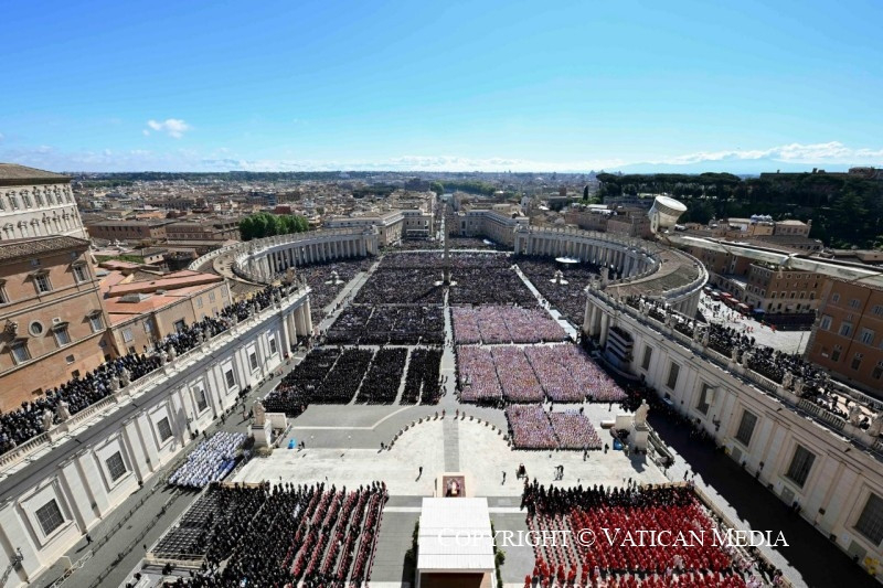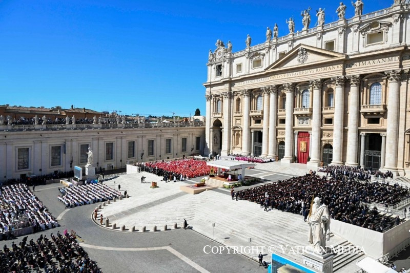 A fenséges Szent Péter téren, ahol Ferenc pápa oly sok alkalommal ünnepelte az Eucharisztiát és elnökölt nagy találkozókon az elmúlt tizenkét év során, most imádságra gyűltünk össze halandó teste mellett, szomorú szívvel, mégis a hit bizonyosságától támaszt nyerve, mely biztosít: az emberi létezés nem a sírban, hanem az Atya házában végződik, egy olyan boldog életben, amely nem ismer alkonyt.