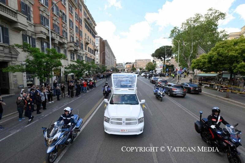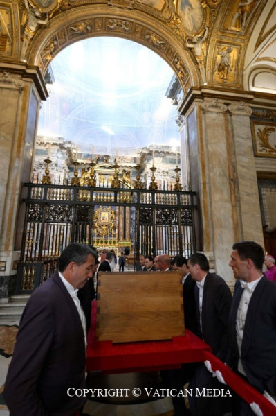 Re bíboros szenteltvízzel meghintette és megtömjénezte a koporsót, majd a Magnificat éneklése közben elindult a liturgikus menet, bevitték a koporsót a bazilikába, ahonnan elindult a Santa Maria Maggiore-bazilika felé.