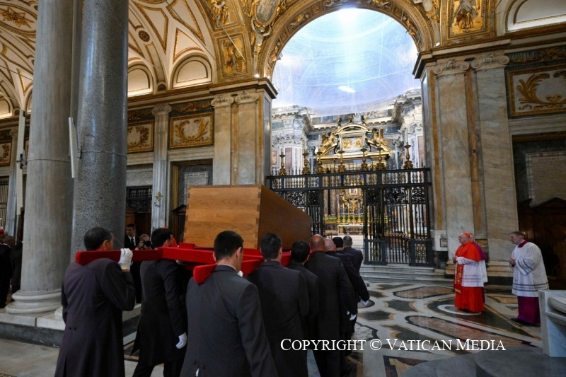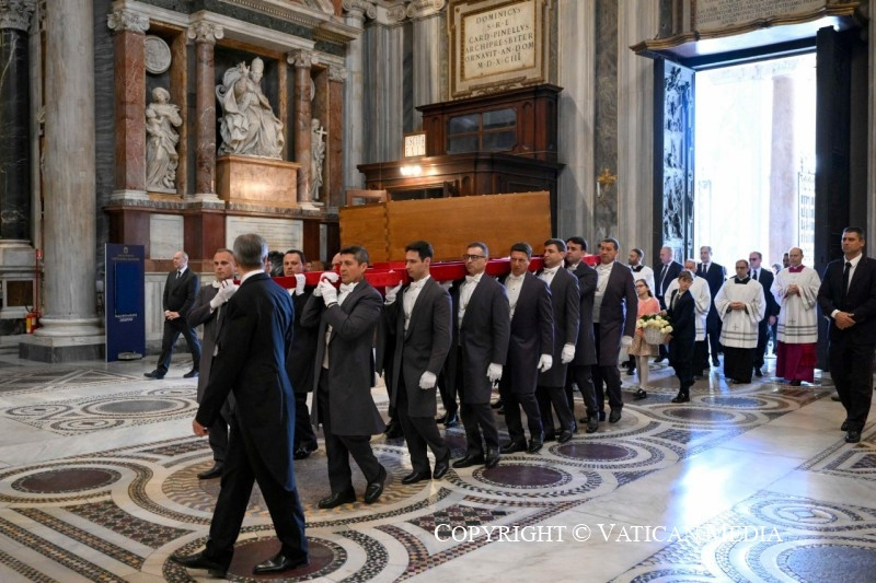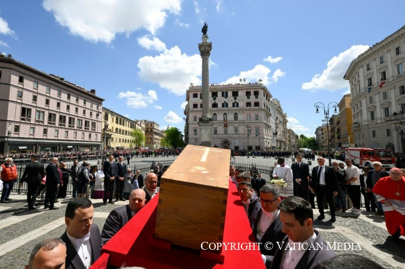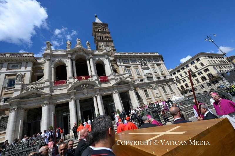 A pápát kísérő bíborosok és a Svájci Gárda tagjai, majd a koporsó is megérkezett a bazilikához, amelynek lépcsőin a Szentatyát a szegények várták, akik oly fontosak voltak neki péteri szolgálata során, akik felé mindig kiemelt szeretettel és figyelemmel fordult. A rászorulók – hajléktalanok, fogvatartottak, menekültek – képviselői, összesen negyvenen egy-egy szál fehér rózsával vettek búcsút a Szentatyától. Ott voltak a pápa családtagjai, a lépcsősoron jobb kéz felől pedig a templomban szolgáló papság, a Santa Maria Maggiore-bazilika káptalanjának kanonokjai és domonkos szerzetesek, akik gyóntatószolgálatot látnak el a templomban.