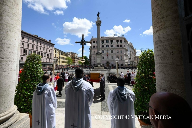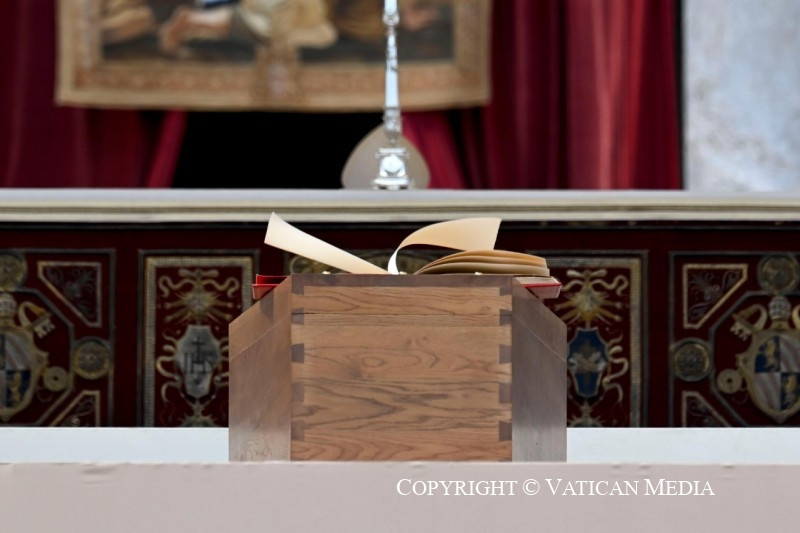 Ferenc pápa pénteken este már lezárt, egyszerű, belülről cinlemezzel borított fakoporsóját az ünnepélyes menet kíséretében vitték ki a bazilikából az előtérben felállított szabadtéri oltárhoz, amelyben ott volt a néhai pápának oly kedves Salus Populi Romani-ikon. A korporsóba zárva ott volt a rogito, az okirat a pápa haláláról, amely tartalmazza az életének, az Egyházért végzett szolgálatának leírását is.