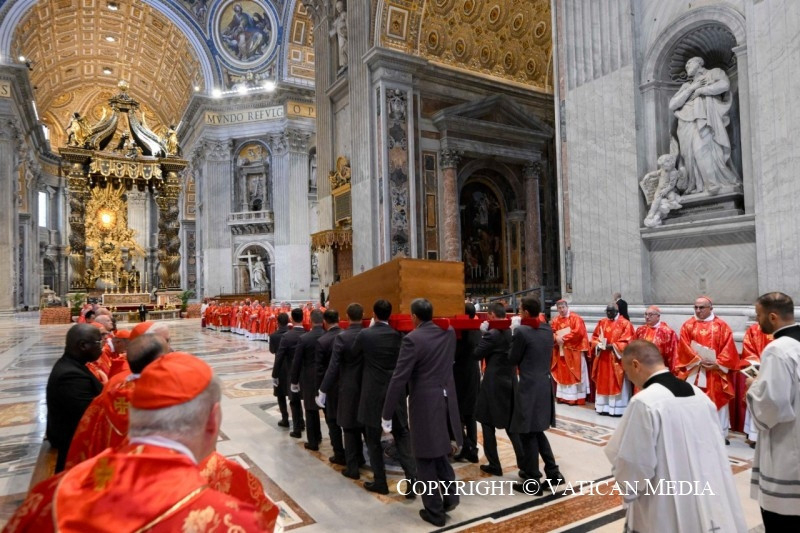 Az Ordo Exsequiarum Romani Pontificis, a pápák temetéséről szóló liturgikus könyv előírásai szerint zajlott a szertartás. A bazilika főhajójában 10 órakor elindult a koncelebráns bíborosok, köztük a keleti egyházak pátriárkáinak menete. A papság piros miseruhát viselt, ősi hagyomány szerint, ahogy a pápát is – a vértanúságra utalva – piros miseruhában temetik el.