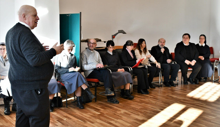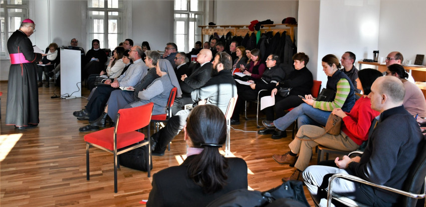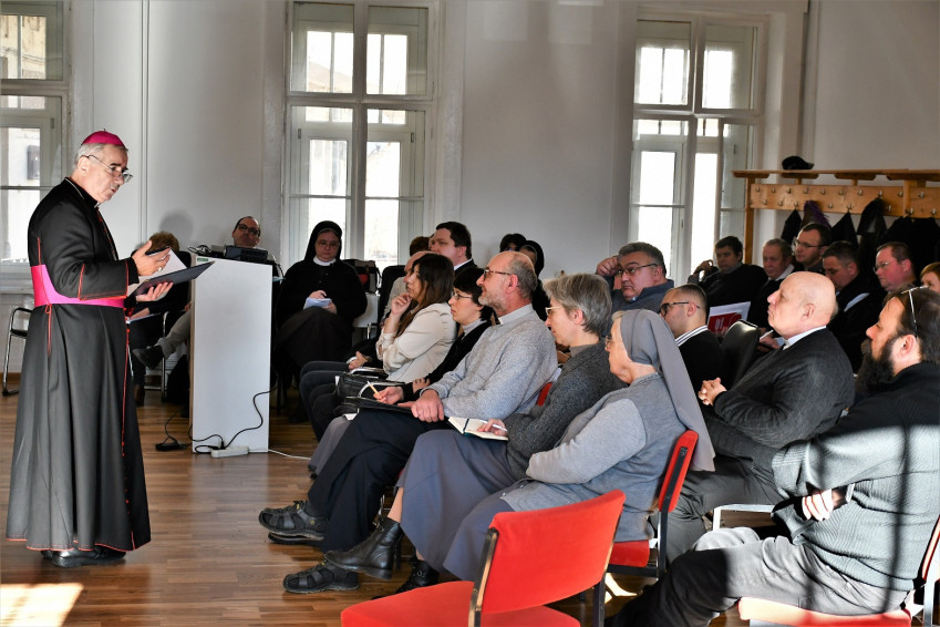 A jelenlévőket Dirschl Johann általános püspöki helynök, egyházmegyei tanfelügyelő üdvözölte, és ismertette a találkozó programját, amely a megyéspüspök szinodális útról szóló előadását, valamint kiscsoportos foglalkozásokat foglalt magában.