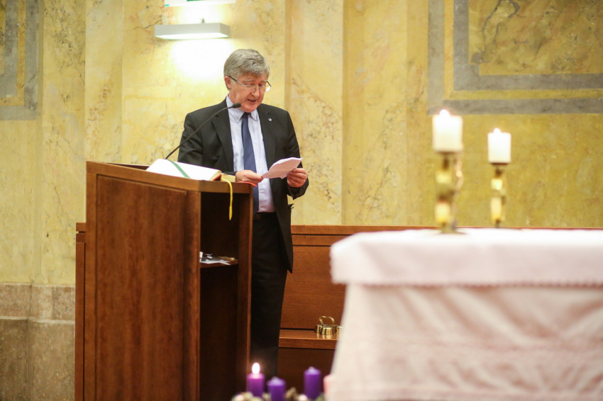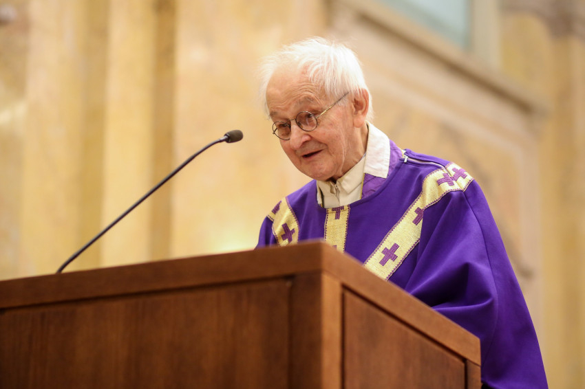 A szentmise homíliáját e szavakkal zárta: „Elmúltak fölöttem a tanítás és az alkotás évei. Visszahúzódtam Duna-parti rendházunkba, hogy nyugdíjasként azokkal az emberekkel találkozzam, akik életemben tanítványaim, barátaim, társaim voltak. Olyanokkal, akik előttem jártak, és lassan elköltöztek a másik világba, ahova bennünket is várnak. Így telt hát el fölszentelésem óta hatvan év, melyek áldásaiért most hálát adok az Úristennek. De kérem is, hogy azon, amit elkezdett velünk, illetve általunk, maradjon az ő áldása és vezesse tovább olyan utakra, melyeket már nem mi gondolunk ki, amikben mégis a jövőnek reménye sarjad. Így kérem az Úristent arra is, hogy az én életem hátralévő idejét tegye áldottá, készítsen föl arra, hogy elbúcsúzzam azoktól, akiket itt hagyok, tudjak igazi szívvel, fiatalsággal készülni a vele való találkozásra.”