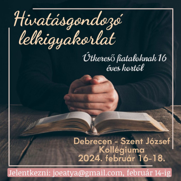 A február 16. és 18. között, péntek estétől vasárnap ebédig tartó hivatásgondozó lelkigyakorlat helyszíne: Szent József köznevelési intézmény kollégiuma (Debrecen, Varga u. 2.).
