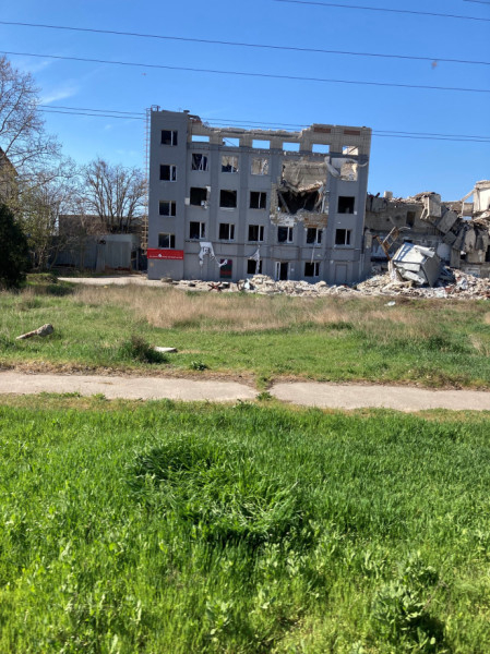 Beérkezve Herszonba szembekerültünk a háború kézzelfogható nyomaival. Sérült épületek, házak, amikről a légnyomás leszaggatta a tetőt, az emberek fóliával pótolták, hogy lakható legyen. Valahol már elindult az újjáépítés, de sok még a lefóliázott tető.