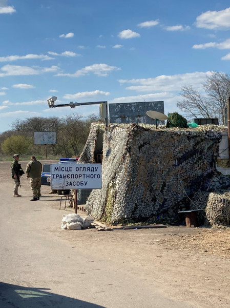 A város határában egy bunkerszerű megállítóponthoz értünk. Mind minket, mind az autót lefényképezték. Volt igazolásunk, hogy humanitárius segélyt viszünk Herszonba. Alá kellett írnunk egy nyilatkozatot, hogy a saját felelősségünkre lépünk be.