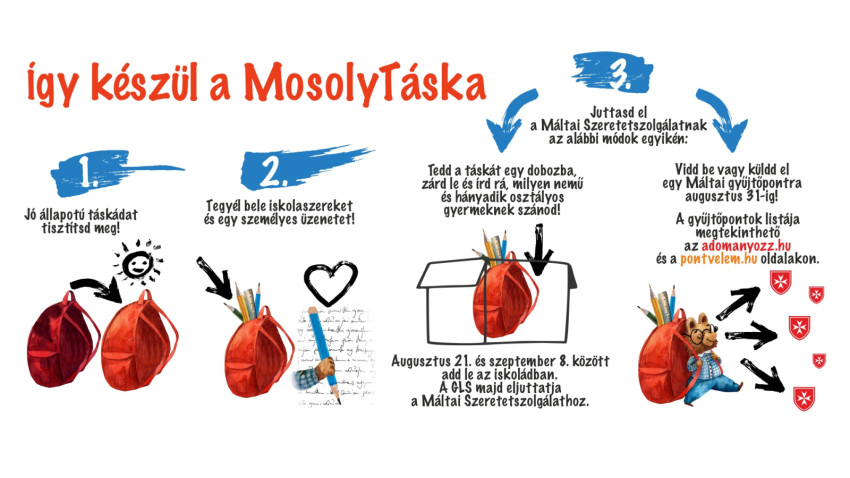 A legszegényebb családok gyermekei támogatására harmadik alkalommal szervezi meg nyári iskolatáska-gyűjtését a Máltai Szeretetszolgálat, a PontVelem Okos Program és a GLS Hungary. A MosolyTáska gyűjtés – amellett, hogy a táskák segítséget nyújtanak a rászoruló családoknak a következő iskolakezdéskor –, arra ösztönzi a gyerekeket, hogy ahogy a pénzügyi tudatosság és a környezetvédelem, úgy a segítségnyújtás is legyen természetes része az életüknek.