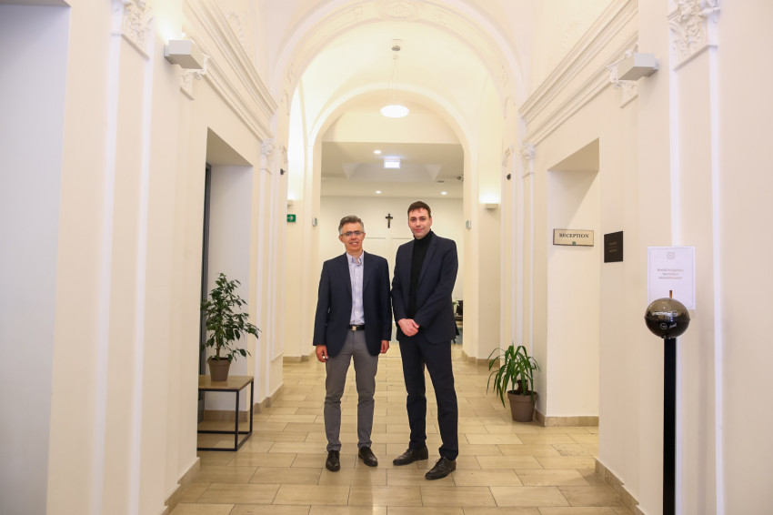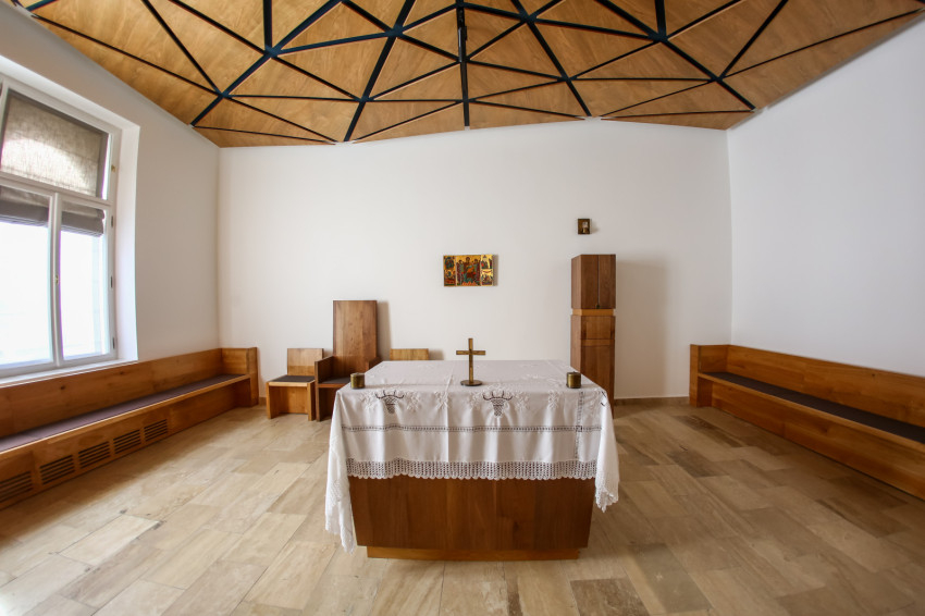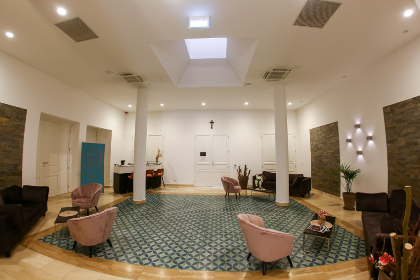 Az épületbe lépve letisztult, elegáns, magas belmagasságú belső tér tárul elénk, a szemközti falon rögtön észrevesszük a feszületet. Marik Gergely a következőket mondja: „Úgy gondolom, a mai világban szükség van elkötelezett szolgáltatókra. Az intézménynek az Esztergom-Budapesti Főegyházmegye a fenntartója, ezt természetesen a weboldalunkon is feltüntetjük.”