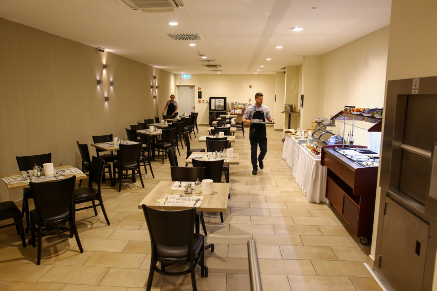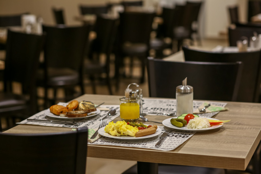 Velencei Zsolt, a hotel igazgatója átvezet bennünket a reggelizőterembe, ahol büféreggelit kínálnak a vendégeknek négycsillagos szállodai színvonalon: hatféle melegétellel, az évszaknak megfelelő termékkínálattal, a külföldi vendégek igényeire is odafigyelve, időről időre változtatva a gazdag választékot.