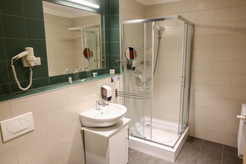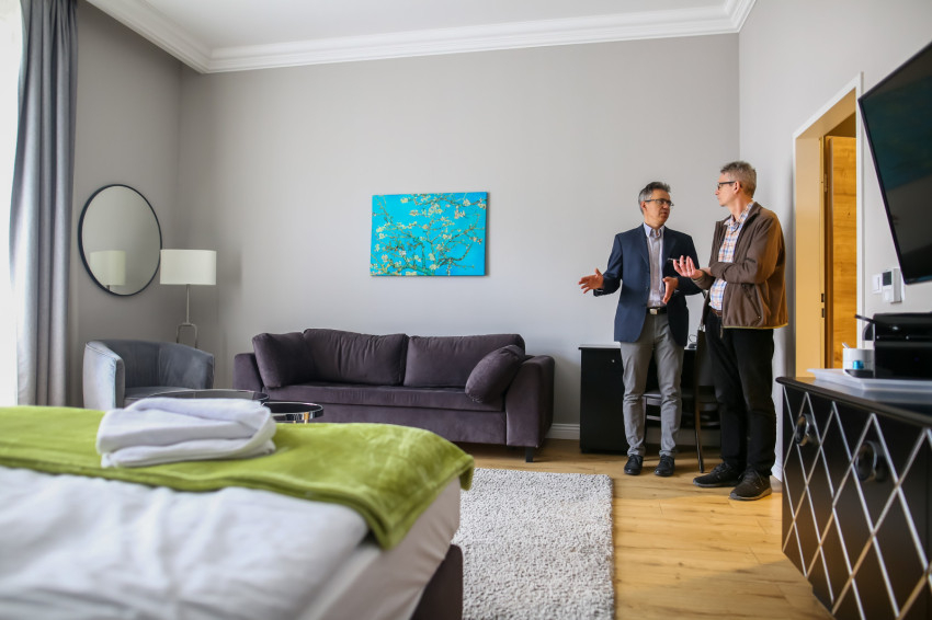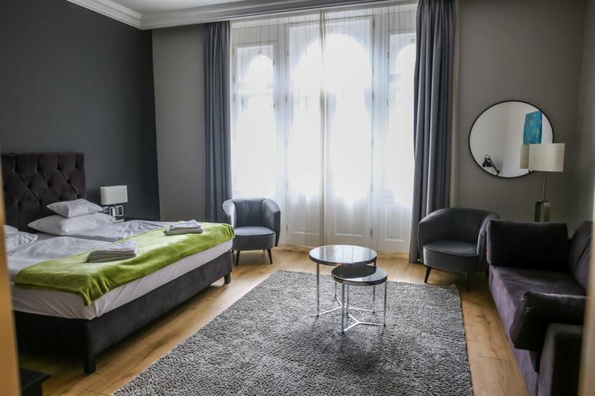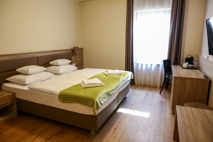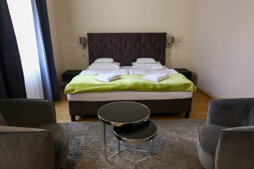 A reggelizőtermet elhagyva továbbra is Velencei Zsolt kalauzol minket az épületben. Bemutatja a négycsillagos hotel szobáit, amelyek az épület két (régi és új) szárnyában helyezkednek el. A hat superior, a szintén hat prémium és a huszonnégy standard szobában egyidejűleg nyolcvan vendég elszállásolására van lehetőség.