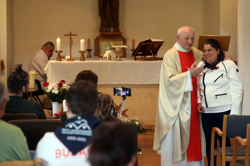Mert az ember nemcsak az ételre éhes, hanem a… „Szeretetre!” – vágta rá az első sorokban ülő egyik lakó, Jónás Renáta, mindenki örömére és derültségére. „Tökéletes. Őszintén mondom, nem beszéltük meg előre” – mondta mosolyogva, a fiatalt átölelve Imre atya, aki szentbeszédében többek között kiemelte: „Az ember léte az együttlét, az együttlét pedig szeretet.”