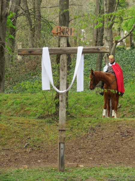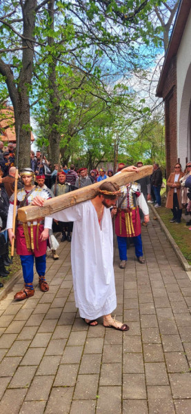 Cirenei Simon szerepében a kegyhely plébánosa, Keresztes Andor volt látható, aki nem húzott zsidó ruhát, hanem reverendában volt Jézus segítségére.