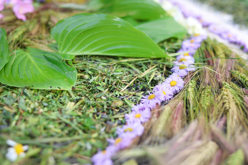 A családok, baráti közösségek az ünnep előtt összegyűjtik a szőnyegkészítéshez használható virágokat, hogy az összefüggő virágszőnyeg egy-egy darabját készíthessék.