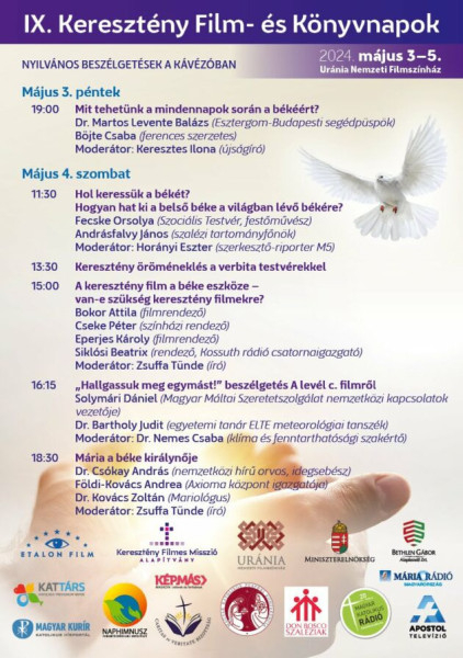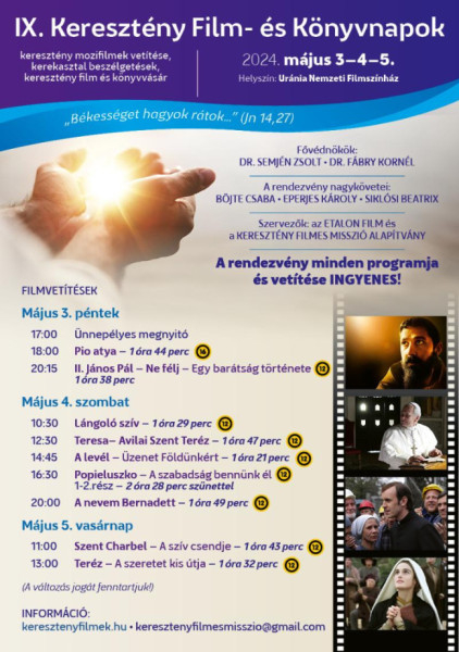 A május 3. és 5. között, péntektől vasárnapig zajló film- és könyvnapok programjában keresztény mozifilmek vetítése, kerekasztal-beszélgetések, keresztény film- és könyvvásár szerepel.
