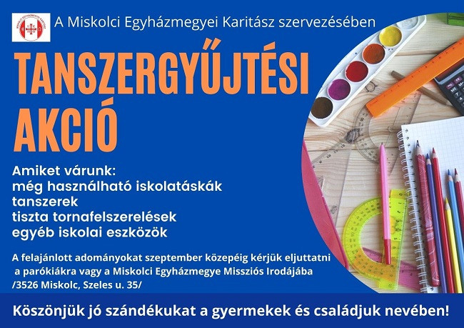 A Miskolci Egyházmegyei Karitász hálás szívvel fogadja a feleslegessé vált, de még használható tanszereket, iskolatáskákat, tornafelszereléseket és egyéb iskolai eszközöket, hogy az arra rászoruló családok számára megkönnyítsék az iskolakezdést.