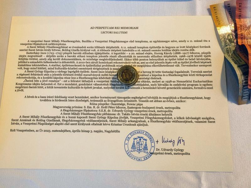Az üzenethordozóban többek között korabeli fizetőeszközt és négy levelet is találtak. A régi, de erősen károsodott alapján elkészített új hengert a régi dokumentumok másolataival együtt 2022 őszén helyezte el Udvardy György veszprémi érsek a templomkereszt gömbjébe, beletéve a Ferenc pápától kapott rózsafüzérét is.