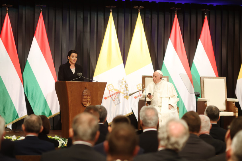 Novák Katalin hangsúlyozta, hogy ma különösen oda kell figyelnünk a szükséget szenvedőkre, csodálatos példát mutató szentjeink nyomán, mint Szent Erzsébet, aki a rászorulók, kiszolgáltatottak, menekültek segítésének, az irgalomnak a szimbólumává vált. Szent Erzsébet élete is igazolja, hogy a nők különös felelőssége rámutatni: jó kormányzás irgalmasság, a kiszolgáltatottak iránti szolidaritás nélkül nem lehetséges. Az államfő elmondta, hogy ajándékai között ott vannak Szent Erzsébet rózsatövei, és kérte, a pápa rájuk tekintve gondoljon mindazokra, akiknek lelki táplálékot ad, örömet és reményt hoz látogatásával és szolgálatával.