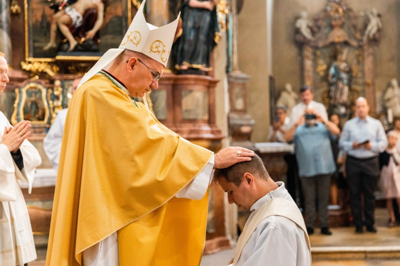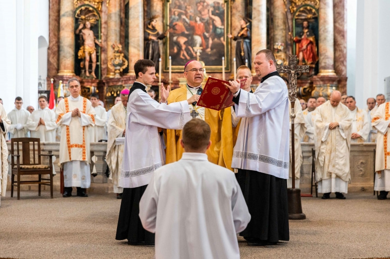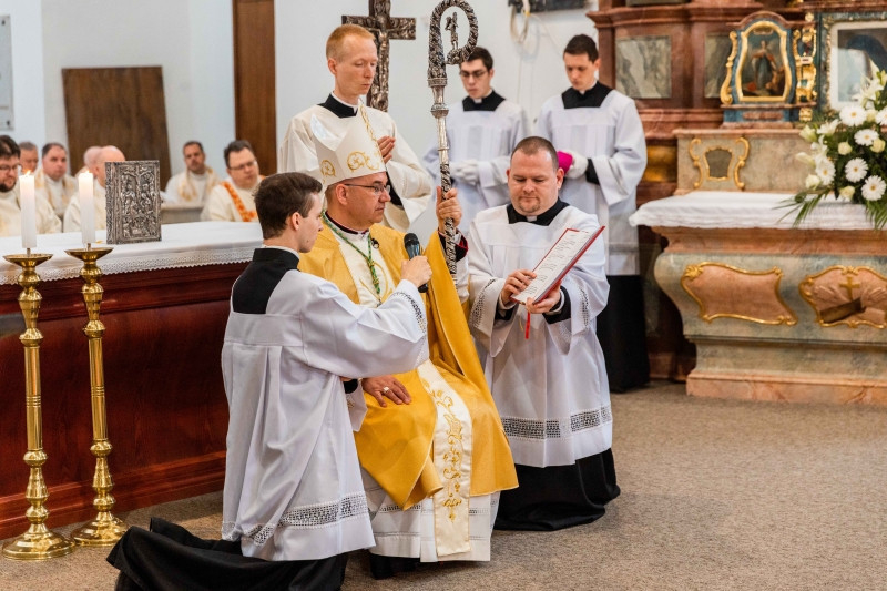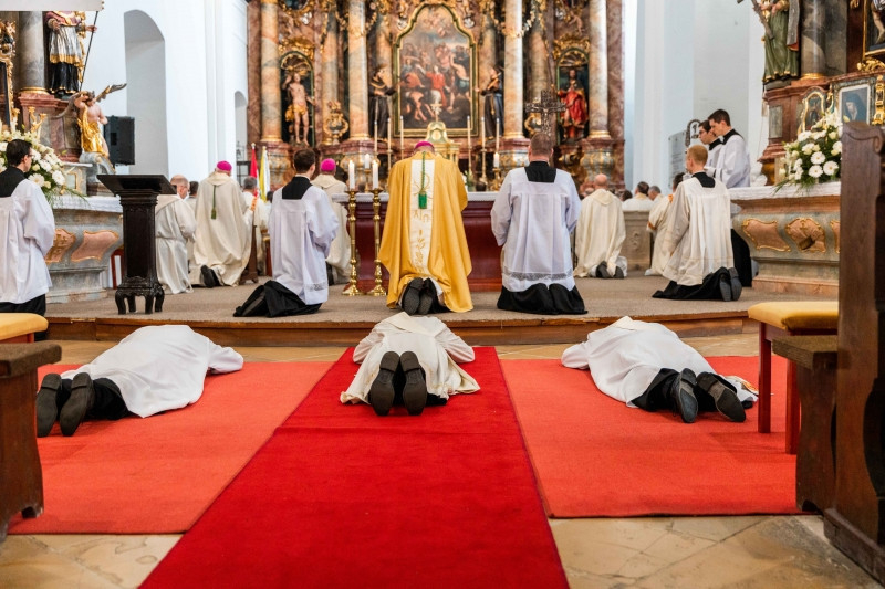 A szentbeszéd után a jelöltek engedelmességet fogadtak főpásztoruknak. A Mindenszentek litániája alatt arca borulva imádkoztak kérve a kegyelmeket szolgálatukhoz, amelyre ebben a szent pillanatban életüket szentelik.