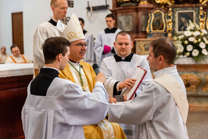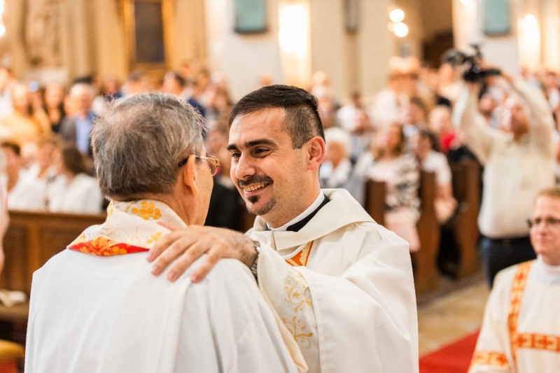 Ezt követte Szabó Gábor és Urbán Gábor diakónusok áldozópappá szentelése. Szép pillanata volt a szertartásnak, amikor a püspöki kézrátételt követően minden jelen lévő pap – mintegy negyvenen – kézrátétellel imádkoztak a szentelendőkért. A püspök felszentelő imáját követően az erre felkért és a hivatás felé vezető úton fontos szerepet betöltő paptestvérek palástot adtak a két újmisésre, majd azok átvehették a kelyhet, a paténát és rajta az ostyát papi szolgálatuk jelképeként. Először a püspök köszöntötte békecsókkal a frissen szentelteket, majd a felhangzó Tu es Petrus című Liszt-mű alatt a papok egymás után immár testvérükként köszöntötték a két papot.