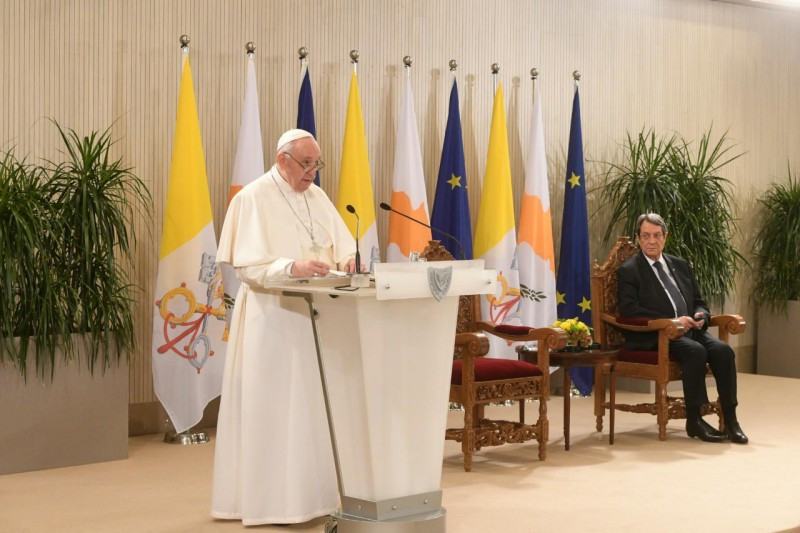 Zarándokként jöttem ebbe a földrajzilag kicsiny, de történelmileg nagy országba – kezdte beszédét a pápa. – Ciprus a civilizációk útkereszteződésében nyitott kapu, kikötő, mely összeköt, hivatása a találkozásra szólítja. Makariosz érsek, az első ciprusi elnök neve boldogot jelent, és Jézus szavait idézi eszünkbe a nyolc boldogságról. A boldogmondások pedig a kereszténység örök alkotmányát tárják elénk, boldogok a lélekben szegények, akiket az élet megsebzett, akik szelídek és irgalmasok, akik feltűnés nélkül gyakorolják az igazságosságot és a békét.