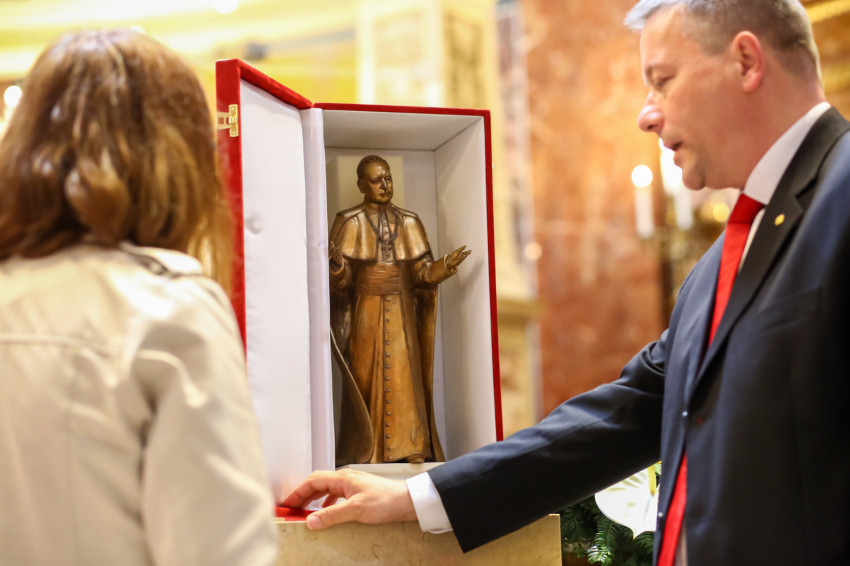 „Egyedülálló ajándék vagy mindannyiunk számára!” – újra kitört a tapsvihar, megerősítve a laudáló szavait. Szólt a taps, miközben a szolgálatban megöregedett pap szerényen és alázatosan állt az ajándékba kapott Mindszenty-szobor mellett.