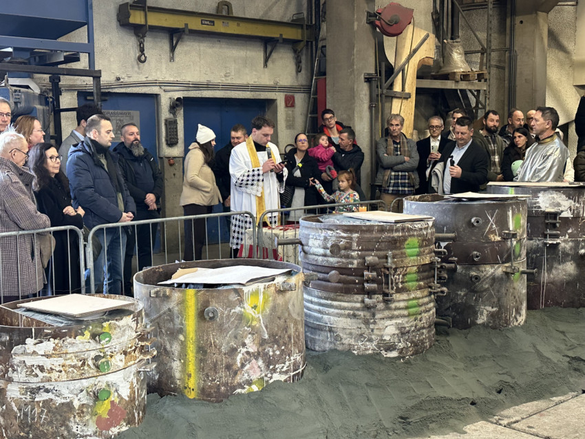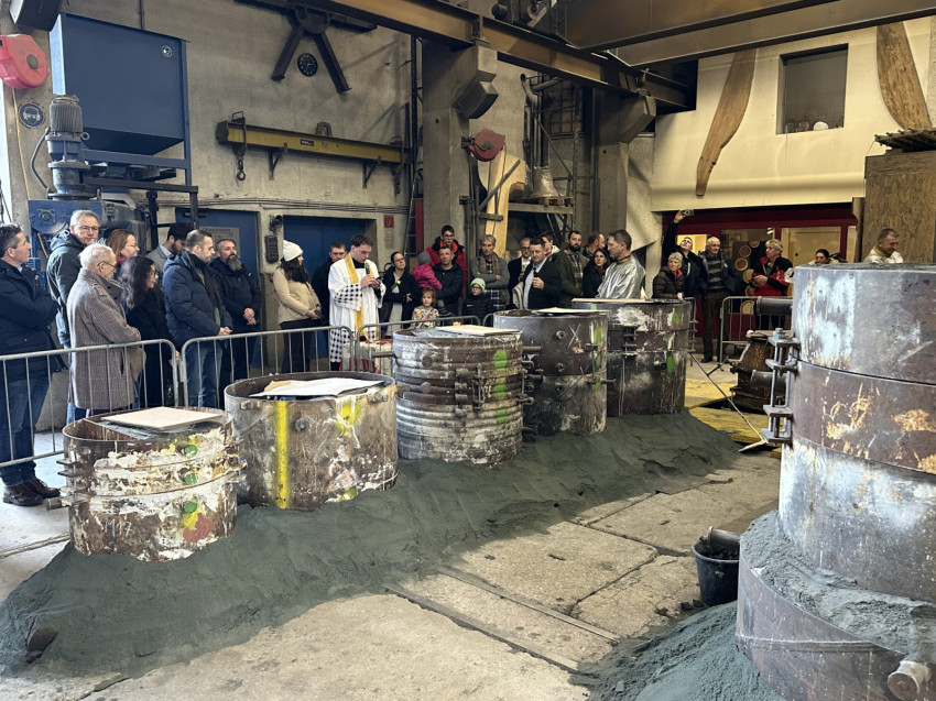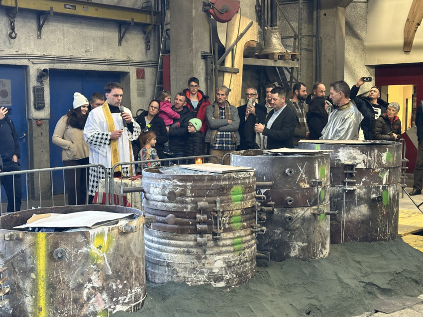 Maga a harangöntés rendkívül izgalmas és egyben veszélyes folyamat, hiszen a heteken át tartó olvasztás után az 1200 fokos nyersanyagot kellett bejuttatni a formába. A veszprémi küldöttség Kulcsár Dávid káplán vezetésével imádsággal kísérte a folyamatot, hogy sikeresen záruljon.