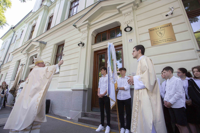A főpásztor beszédében felidézte: a felújítás különleges momentuma volt, amikor felkerült a kereszt az iskolaépület homlokzatának tetejére. A korabeli fotókon látszik, hogy az államosításig piarista gimnáziumként működő iskola tetején látható volt a kereszt. Palánki Ferenc emlékeztette a jelen lévő diákokat Szent József ünnepére, amikor ezt a keresztet megérinthették a Szent Anna-székesegyházban, ahol a főpásztor megáldotta, majd elhelyezték az iskola épületének tetején.
