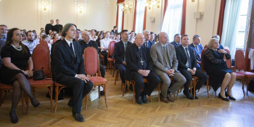 Az ünnepség a díszteremben folytatódott. Bódis Zoltán, az intézmény vezetője beszédében köszönetet mondott az egyházmegyének, az építésben részt vevő tervezőknek, kivitelezőknek, az iskola korábbi vezetőségének.