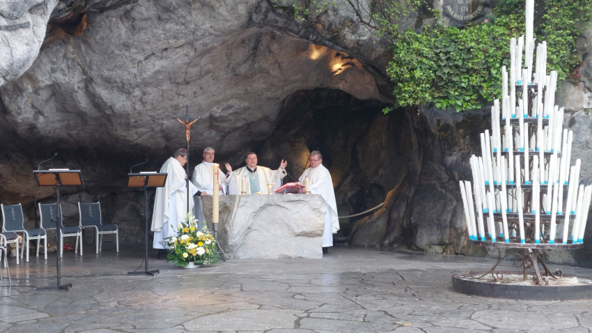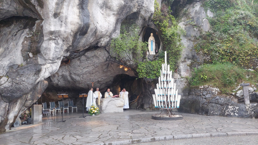 Hétfőn reggel a Grottánál magyar nyelvű szentmisét mutattak be a zarándoklatot kísérő atyák, délután pedig mosdási lehetőség volt a Szűzanya útmutatása nyomán a Soubirous Bernadett által fakasztott forrás vizében, a testi-lelki gyógyulás reményében. A koronavírus-járvány óta nincs alámerítkezés, hanem az imádságok elmondása és rövid csendes elmélkedést követően kezet, majd arcot mosnak, végül isznak a vízből a betegek.