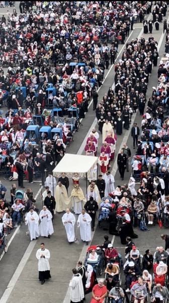 A magyar küldöttség részt vett a nemzetközi szertartásokon, köztük a Rózsafüzér-bazilika előtti téren rendezett szentségi körmeneten, valamint a fáklyás körmeneten, továbbá vasárnap délelőtt a Szent X. Piuszról elnevezett, föld alatti bazilikában tartott ünnepi szentmisén is, amelynek főcelebránsa Gianfranco Ghirlanda SJ bíboros, a Máltai Lovagrend patrónusa (védnöke) volt. A bíboros szentbeszédében a szeretet fontosságára hívta fel a figyelmet: az élet abból áll, hogy a másik ember szolgálatában állva cselekedeteinkkel hatékonyan szeretünk. A szentmisén Silvano Maria Tomasi bíboros, a pápa Szuverén Máltai Lovagrendhez kinevezett különleges küldötte mellett 23 püspök koncelebrált.