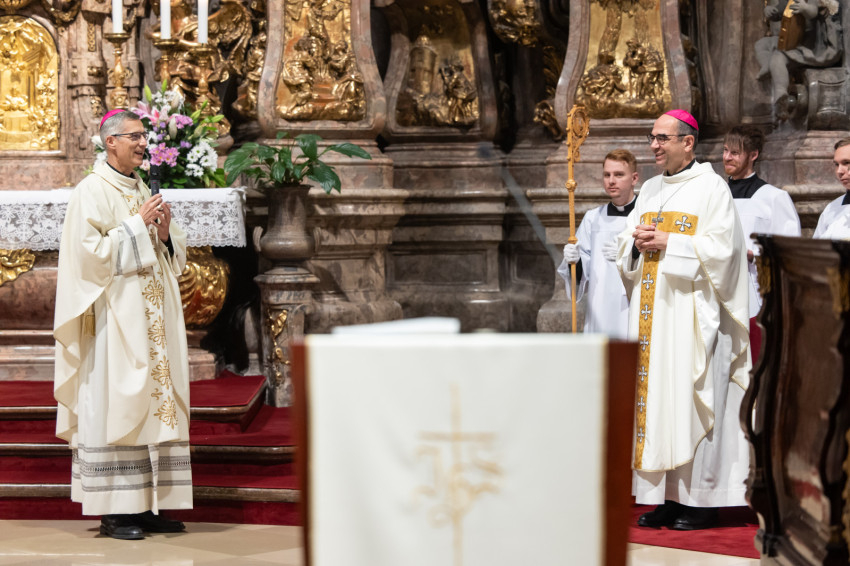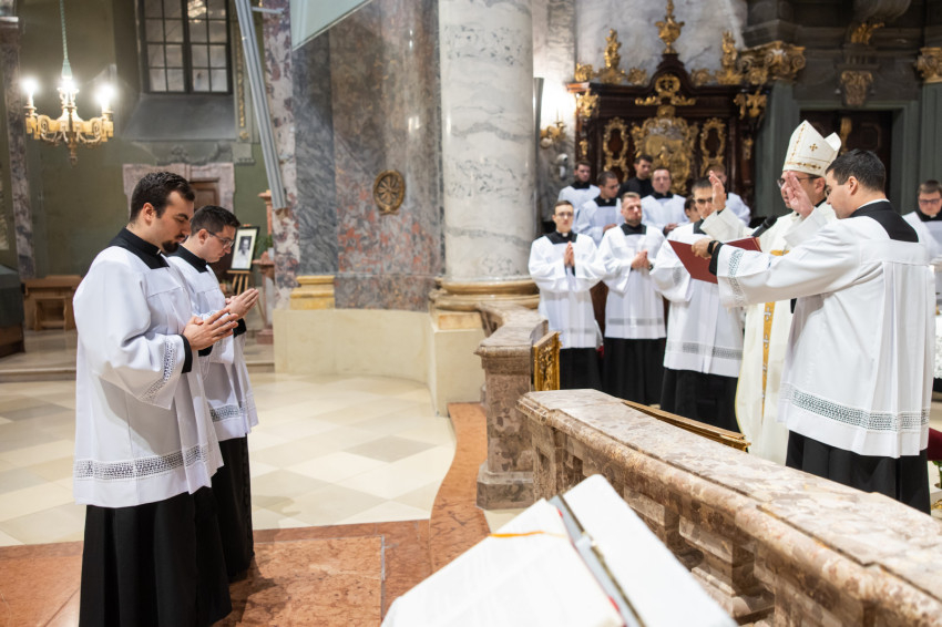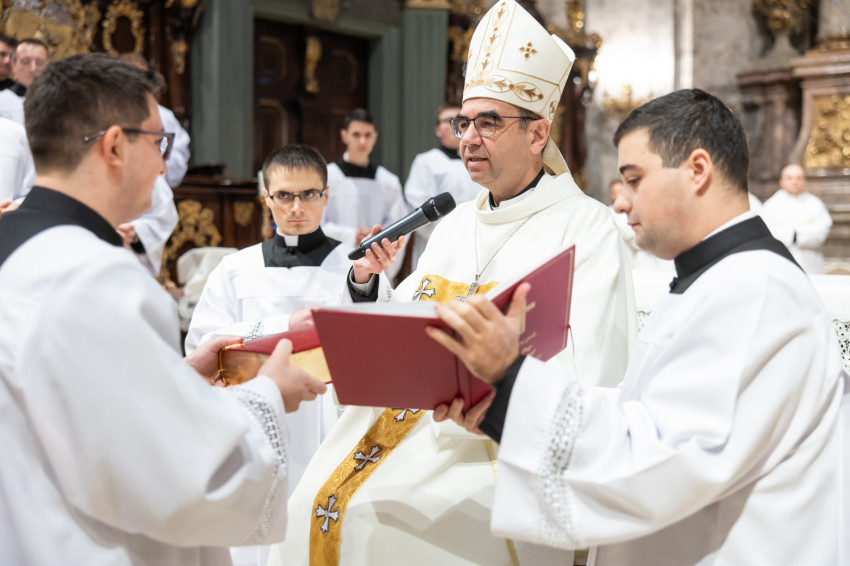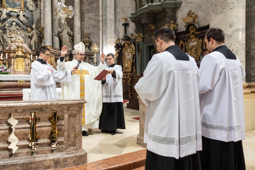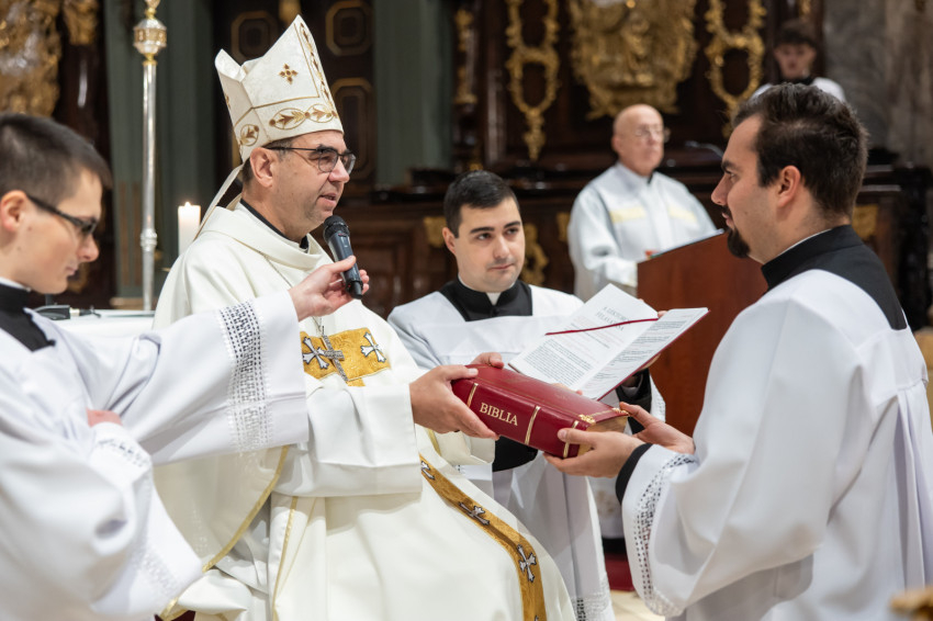 Ezt követően a püspök a felavatandó papnövendékekhez fordult: „Kedves András és Bálint, lektorok lesztek. Isten igéje van rátok bízva. Az az ige, ami nem betű, hanem lélek és élet. Szeressétek a Bibliát, legyen az számotokra mindennapi kenyér. Kedves Nándor, akolitus leszel. Ez a görög szó azt jelenti, hogy követő, aki egészen közel van Jézushoz, aki a nyomában jár. Amikor ott állsz az oltár mellett, ujjongjon a szíved: itt vagyok Jézus mellett, az ő szent testét érinthetem, adhatom. Legyél egészen egy ezzel a titokkal.”