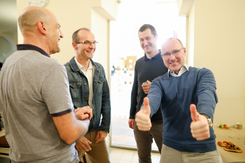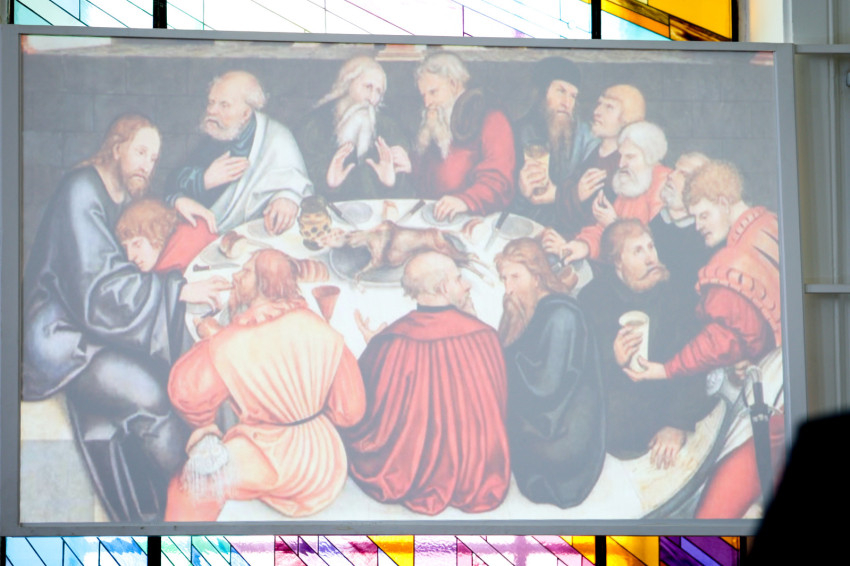 A résztvevők láthattak aztán olyan ábrázolást, amelyen a tizenegy tanítvány falanxként összezár Jézus mögött, az egyetlen pirinyó Júdás meg a földön kuporog. Talán nem véletlen, hogy Visky András, a Kitelepítés című nagyszerű könyv szerzője is