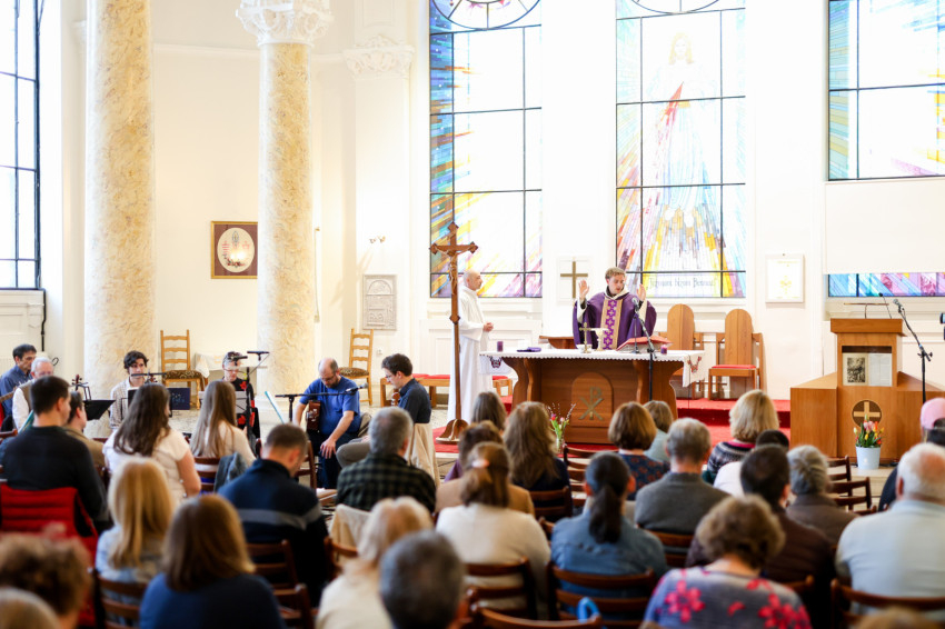 Ezután került sor a szentmisére, amelyet Gács Paszkál ferences szerzetes, pasaréti káplán mutatott be, akinek köszönhetően a nap során lehetőség volt gyónásra is.