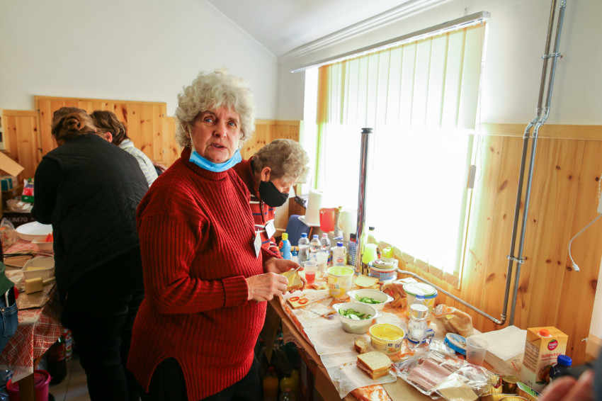 A konyhában például a Recskért Egyesület két nyugdíjas önkéntese dolgozik a helyiekkel. Szendvicseket készítenek, teával, kávéval kínálják az érkezőket.
