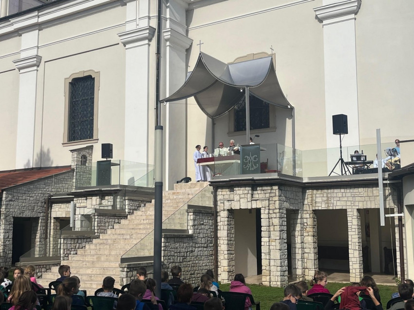 A főpásztor örömmel köszöntötte a hatszáz marianumos diákot és a pedagógusokat, valamint a sárborgádi iskola elsőáldozásra készülő tanulóit.