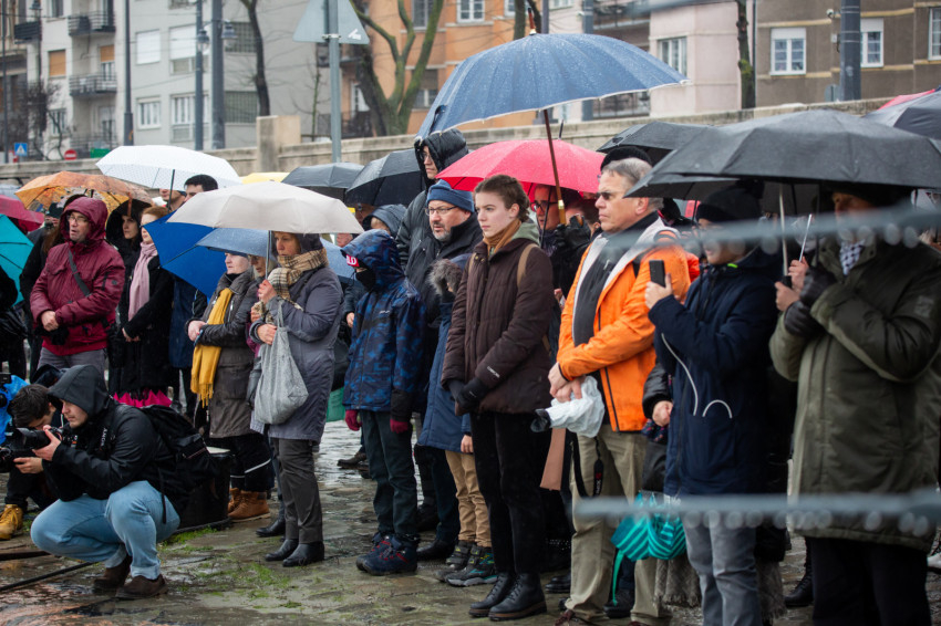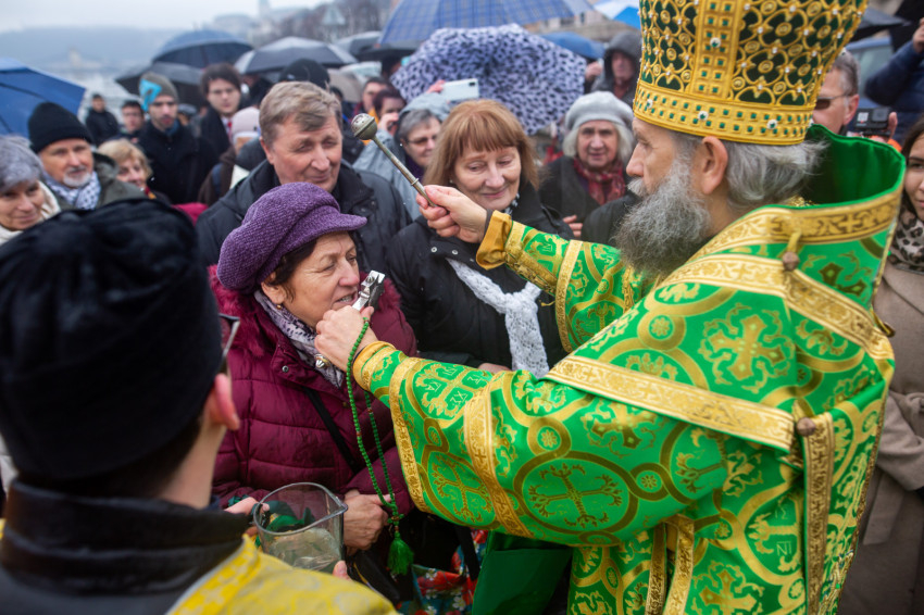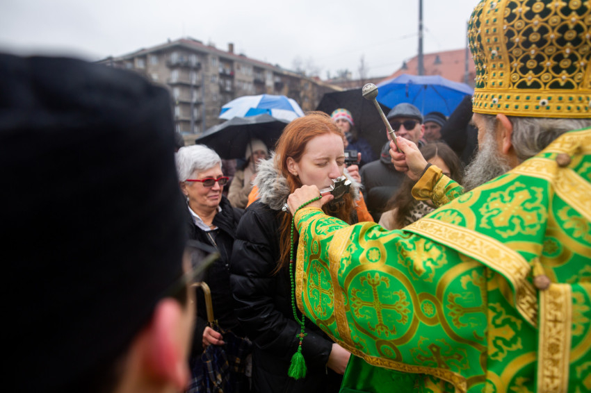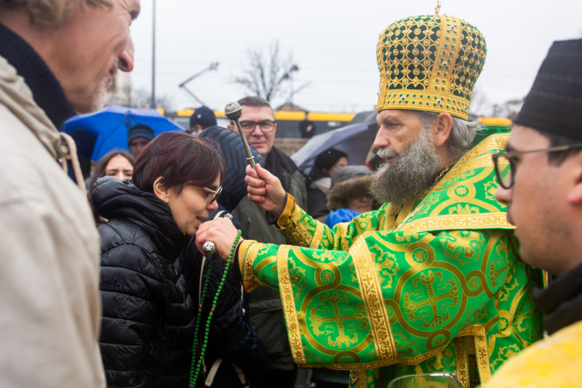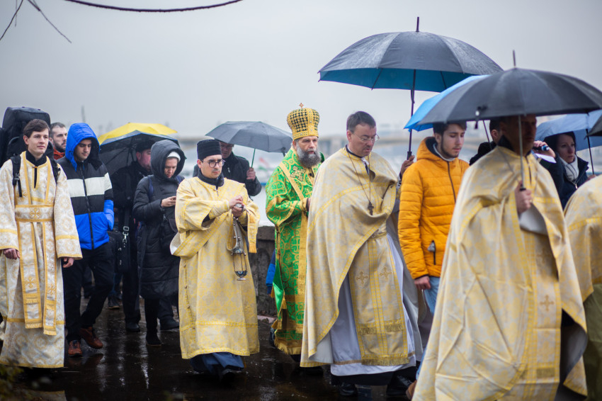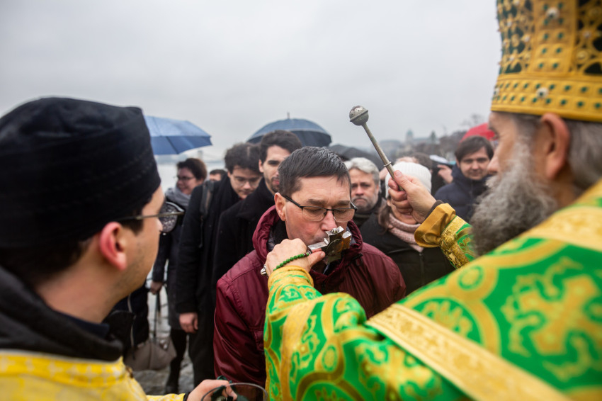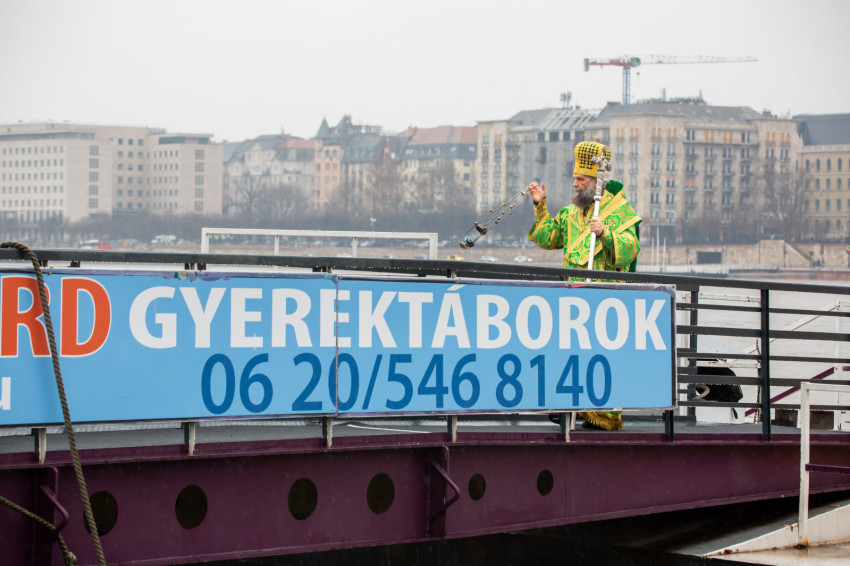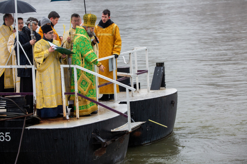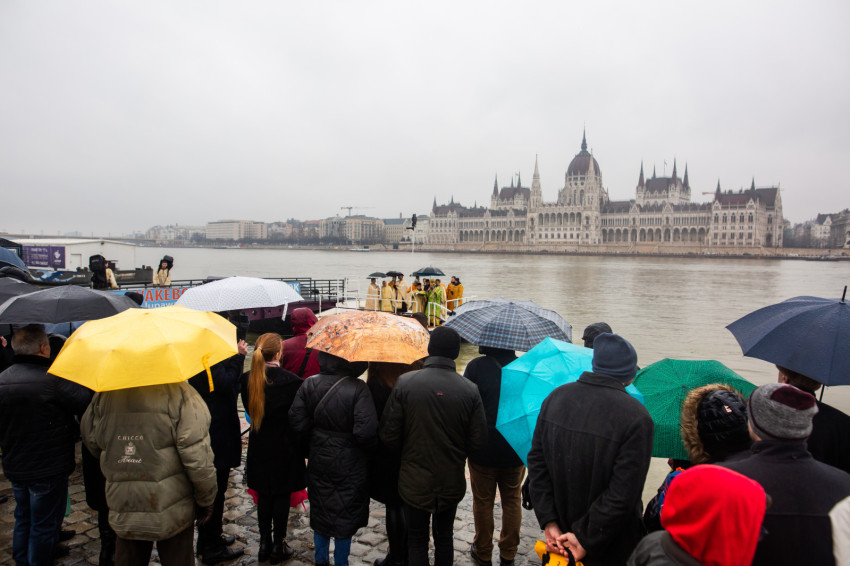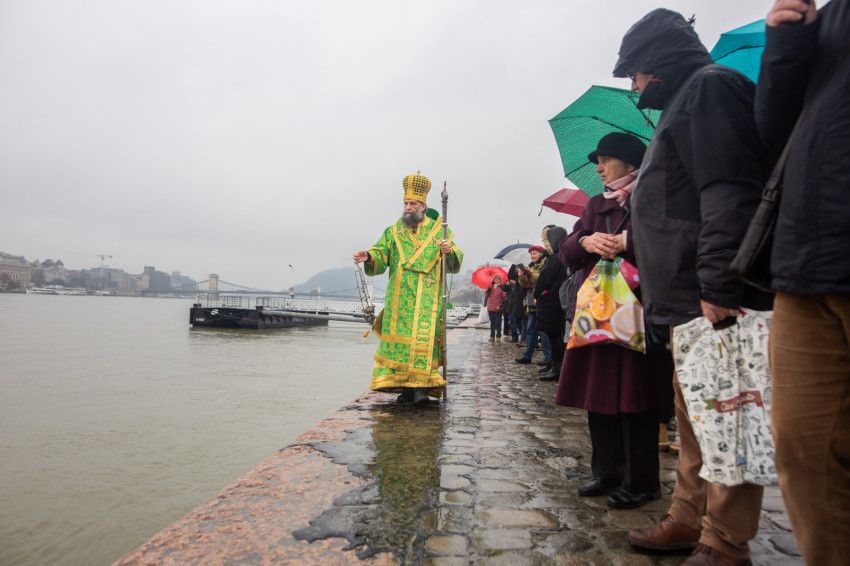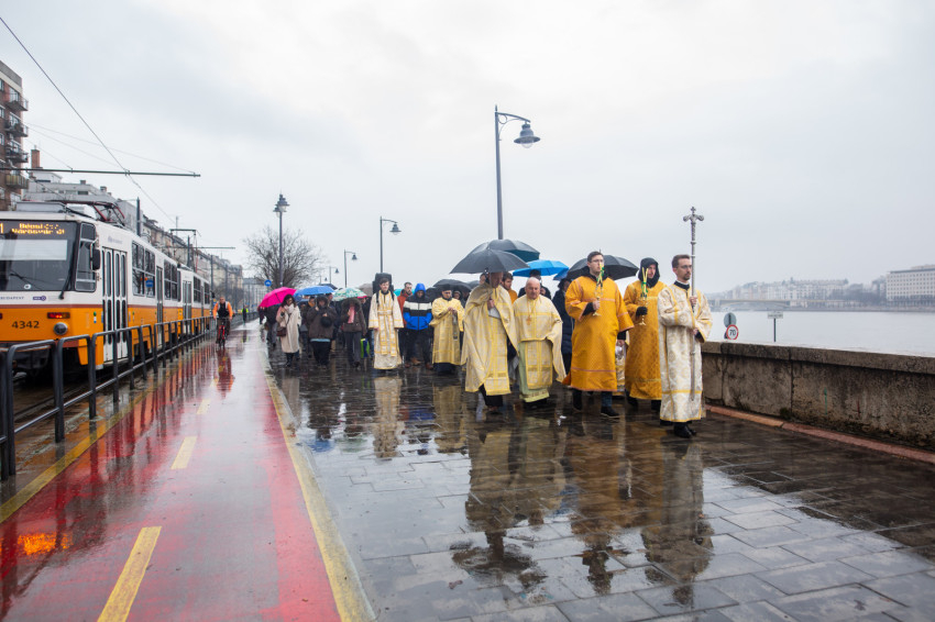 A Szent Liturgia után indult a menet a Dunához. Az eső szakadatlanul zuhogott, miközben a templom papsága és a hívek imádkozva, énekelve végigvonultak a rakparton. „Szentelj meg engem és a vizeket, Üdvözítő” – hangzott fel újra és újra az emberek ajkán.